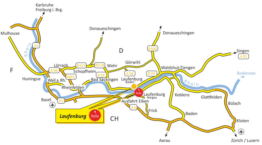 Über die Schweiz: Von Basel über die N3, Abfahrt Eiken nach Laufenburg/Aargau, Grenzübergang Laufenburg oder von Zürich über die N3, Abfahrt Eiken nach Laufenburg/Aargau, Grenzübergang Laufenburg