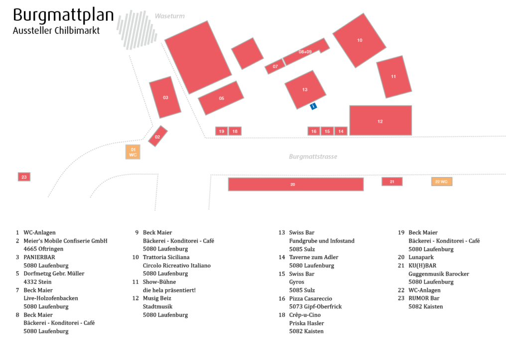 17 bis 21 Uhr Gewerbeschau in der Stadthalle, im Zelt und auf dem Areal hela Sonderschau des Museumsvereins Laufenburg in der Stadthalle Chilbimarkt und Volksfest auf der Burgmatt Fun-Park beim Schulhaus Burgmatt